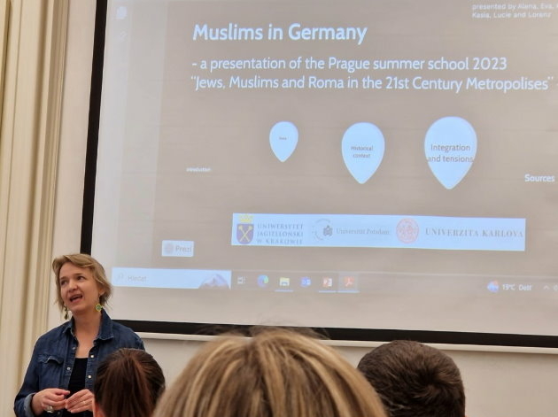 Eine internationale Summer School zum Thema „Jews, Muslims and Roma in the 21st Century Metropolises“ brachte Anfang August 2023 Wissenschaftler:innen, Dozent:innen und vor allem Studierende der Karls-Universität Prag, der Jagiellonen Universität Krakow und des MMZ sowie der Universität Potsdam in der „Goldenen Stadt“ an der Moldau zusammen. Die Summer School war Teil des gleichnamigen, vom Erasmus-Plus-Programm der Europäischen Union geförderten Forschungs-Projektes und hatte insbesondere zum Ziel, Studierende aus Tschechien, Polen und Deutschland mit der Geschichte wie auch der aktuellen Situation von Jüdinnen/Juden, Muslimen/-a und von Sinti und Roma in Zentral- und Osteuropa vertraut zu machen. Ausgewiesene Ethnologen, Migrations-, Kultur- und Politikwissenschaftler:innen – wie Jiri Smlsal (Prag), Serena Hussein (Coventry), Joanna Guzik (Krakow) und Zbynek Tarant (Pilsen) - führten in die heutigen Netzwerke und Selbstverständnisse der erwähnten ethno-kulturellen Minderheiten ein, reflektierten über deren gesellschaftliche Partizipation wie auch über Diskriminierungs- und Solidarisierungserfahrungen. Begegnungen mit Protagonist:innen aus der jüdischen, muslimischen wie auch der Roma Community in Prag rundeten das Programm ab. Von Seiten der Universität Potsdam nahmen Studierende der Jewish Studies, der Religionswissenschaften, Philosophie, Literaturwissenschaften und der Osteuropa-Studien teil. Von MMZ-Seite wurde die Summer School durch Olaf Glöckner begleitet.