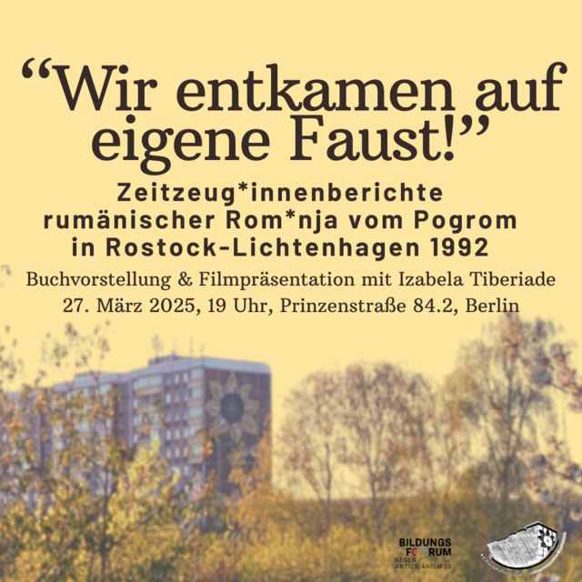 Auf dieser, von dem bei uns zum Thema des Pogroms in Rostock-Lichtenhagen promovierenden Johann Henningsen mit organisierten Veranstaltung werden Videointerviews mit Überlebenden präsentiert. Diese fanden in der bisherigen Erinnerungskultur kaum Gehör. Ihre Perspektiven sind Teil umfassender Recherchen, die 2025 in Buchform unter dem Titel „Wir entkamen auf eigene Faust“ veröffentlicht wurden.